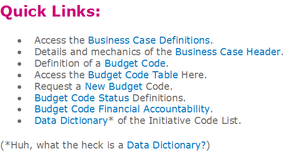 The last section provides additional reading links for those need more information or research. In the following example, links are provided for definition of the fields used in the business case narrative SharePoint list, the ‘INFRA-‘ definition of the header list (see next blog) as well as how to request a new code and the data dictionary entries (a future blog).