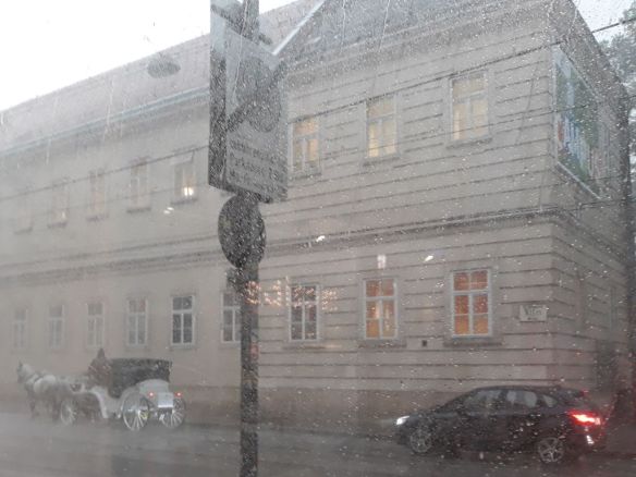 May 11: A break from local public art… a good old prairie evening thunderstorm a few days ago complete with hail, driving wind, lightening and a torrential downpour. Could have been worse I guess, I could have been this carriage driver trying to get back to the stables. Across the street is the University of Vienna.