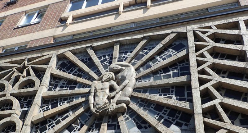 May 9: Art is not limited to free-standing statues, on much of the public housing (IN which many Viennese live) murals are common. The first of many such images this one an intricate cement mosaic.