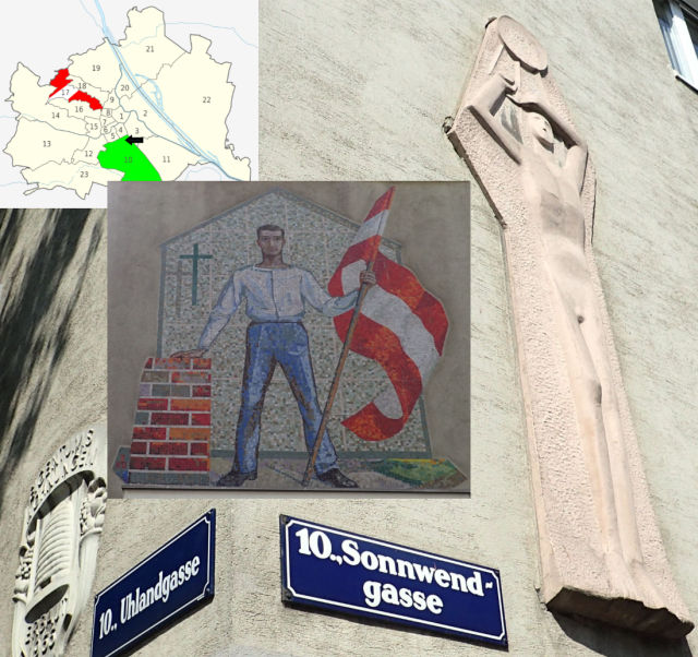 July 29: These are two separate example of social housing, public art and a feature of Viennese architecture – The building spanning the road. I decided to superimpose these two images as a comparison between a social housing project built in the 1950s and another built in the 1980s (back and fore ground). A consistent architecture feature is the raised building over the road entrance and then an inner courtyard (look carefully for the bike).