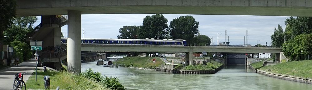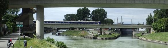 July 30: This picture is taken from where the Danube Canal separates from the main stream (top left) and an irrigation canal (top right), Marchfeld, starts its journey through agricultural land to return to the Danube just before Slovakia. To make the scene a bit more full throw in a few boats, a S-Bahn city train, a bridge supporting a major thorough fare and my bike just by one of the well marked cycling trail heading north out of Vienna (phew!).