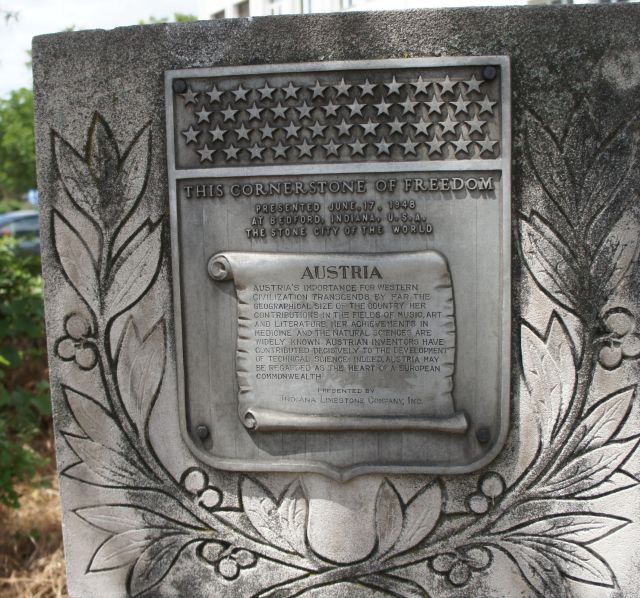 Demokratiezzentrum (translated from German): Monument on the Frankhplatz in Vienna, which was dedicated to the city of Vienna in 1948 by the USA. The memorial bears the following inscription: “This cornerstone of freedom presented June 17, 1948 at Bredford, Indiana, USA, the stone city of the world AUSTRIA.” Austria’s importance for western civilization transcends by the geographical size of the country Indeed, Austria may be regarded as the heart of the European Commonwealth, Presented by Indiana Limestone Company Inc.”