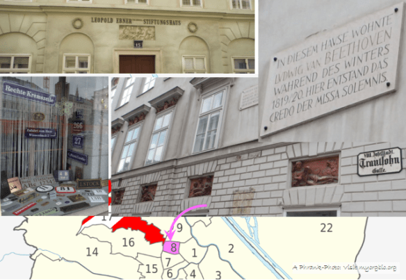 July 8: From the Eight District, three different street scenes starting top left an inlaid sculpture, bottom right more inlaid sculptures and an older style street name sign in Gothic script and on a building where Beethoven lived and worked in 1819-20 and finally, a street sign shop… where all of these street signs come from!