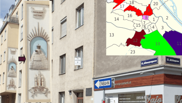 July 12: The 12th district is also highly residential. This image has a number of classic European and Vienna images. Firstly the mosaic on the side of the overhang of the building. The Zu Kaufen sign is offering the corner apartment for sale. Finally, the business in the image is for a flooring company. A relatively common business because of course when you move out you take the floor with you (as well the cupboards, etc.).