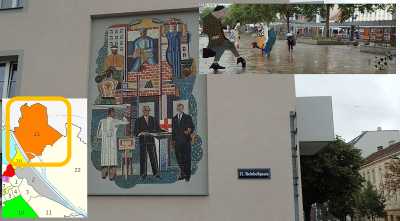 July 21: The 21st district is the sister to the 22nd bordering the Alte Donau (old Danube, a former channel of the river). It has a more urban feel though with seemingly more social housing (such as the mosaic shown here) and numerous cement block apartments. For a bit of whimsy a street art in the insert.