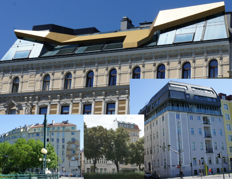 August 16: A collage of corner buildings in Vienna. The question is, if you owned such an apartment, what would you put in such a room? A swivel chair to look out each of the 3+ sides in turn? Filled with plants to catch different sun locations or a series of cat-stands so Fluffly is never bored.