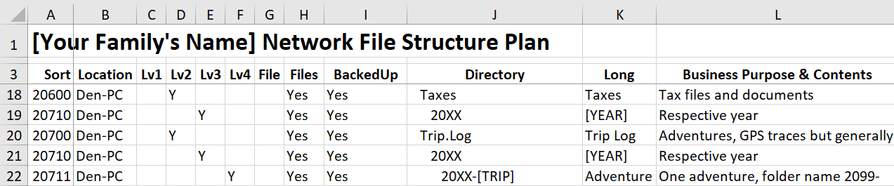 Of course this is a pretty rudimentary tool and there are very sophisticated network mapping tools out there (some of which I reference below). As well, this tool is designed to document how the directory SHOULD look as opposed to an audit of an EXISTING directory. As a result, if you are going to finally clean up that directory of files on your home or corporate computer this tool can help you in the design. If you can not open the above EXCEL file you can also build your own File Structure Plan in Google Docs, etc. using the image and definitions provided below.