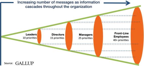- Barfing Downhill: Top leaders think they are being clear by identifying top 3 goals. The problem is that by the time those top 3 make it to the bottom of the organization, they have expanded many-fold meaning that the line-employee is faced with numerous messages that have lost their meaning. As well, barf only rolls downhill with little communication going back up again.