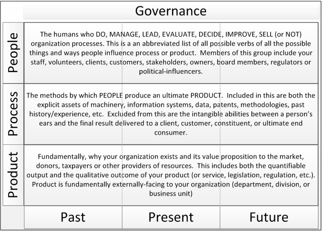 A way to look at the reporting issue is through the Quality Management lens of the “Three-P’s”: People, Process, and Product + Governance. In 2013 I added the concept of time and governance to this familiar heuristic in the blog Three P’s and a G over T Collaboration Framework.