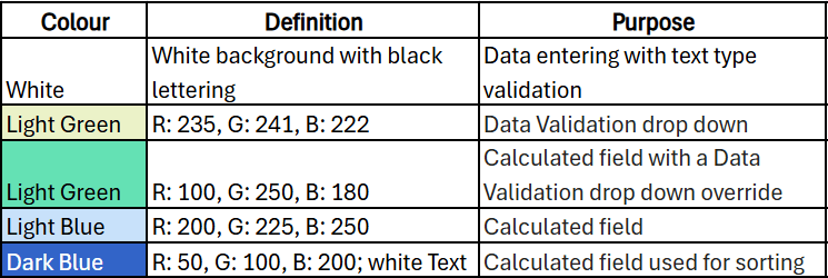 To improve volunteer contributions, colour coding is used consistently throughout the spreadsheet. Light green is a drop down; darker green a calculated field the user can override with a drop down. White is ‘fill your boots’ although there may be some data validation (e.g. must be a date). Blue is a calculated field which you leave alone. Dark blue is a calculated field which is also a sort field. For time tracking, the sort field is largest to smallest based on: DATE + NAME + BILLING.