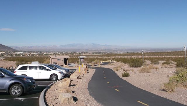 Located near the Clark County Museum (a reference only fans of Pawn Stars would get); this is a large parking area in the 8-o’clock position of the River Mountains Loop Trail. As it turns out, it is also a relatively high spot on the trail (635m) given the descent we experienced and the grinding ascent later in the day.