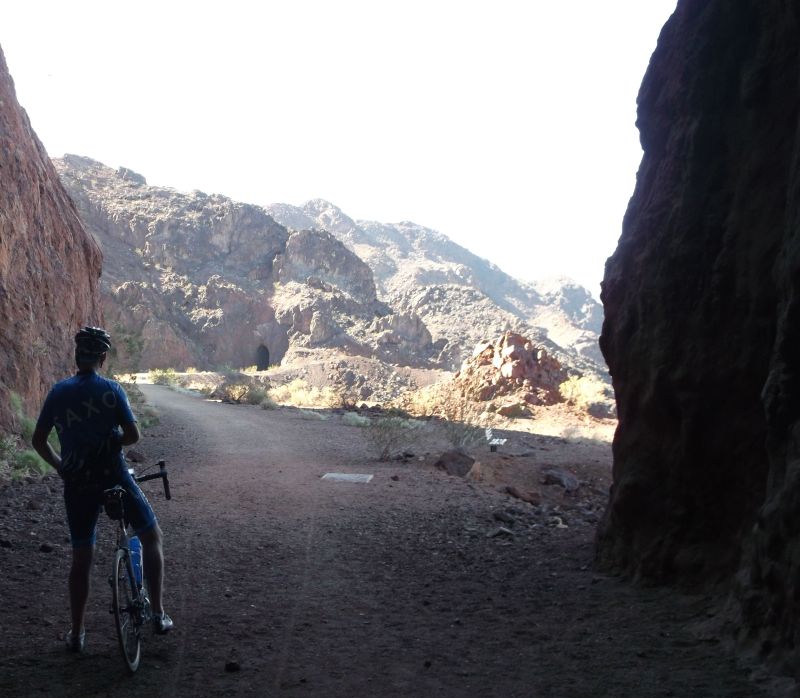 Riding on the rail way bed was fun but we were glad to be descending rather than trying to climb through the loose gravel. Five tunnels give a brief respite from the heat and vistas down to Lake Mead were around most corners.