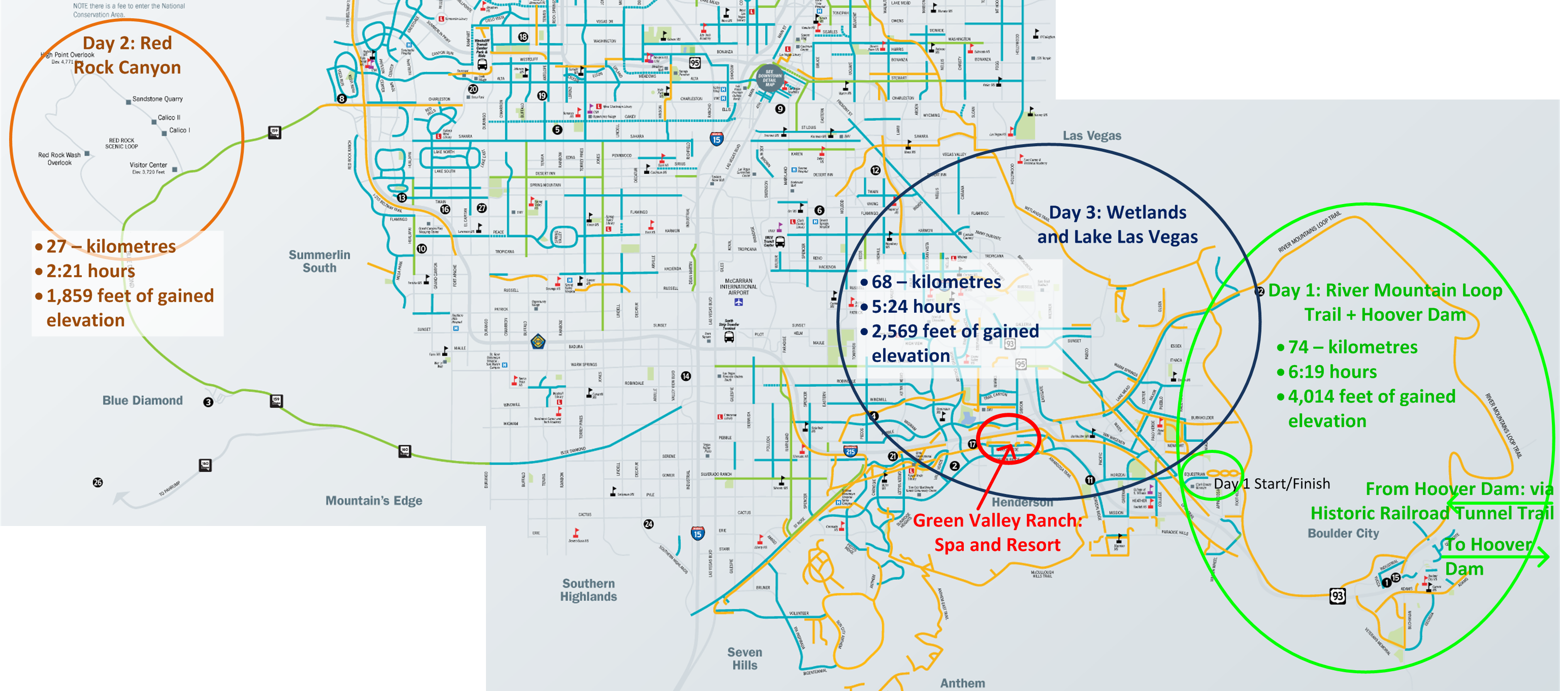 There are a LOT of bike and shared trails in and around metro Las Vegas. I looked for an exact number (and could not find it) but did discover, there are lots. This trip focus on three different sections of these trails: River Mountain Loop, Red Rock Canyon and the Wetlands/Lake Las Vegas.