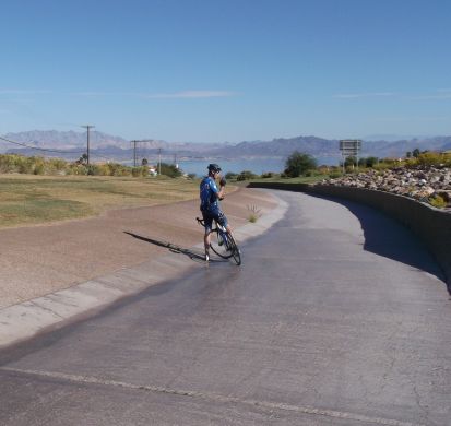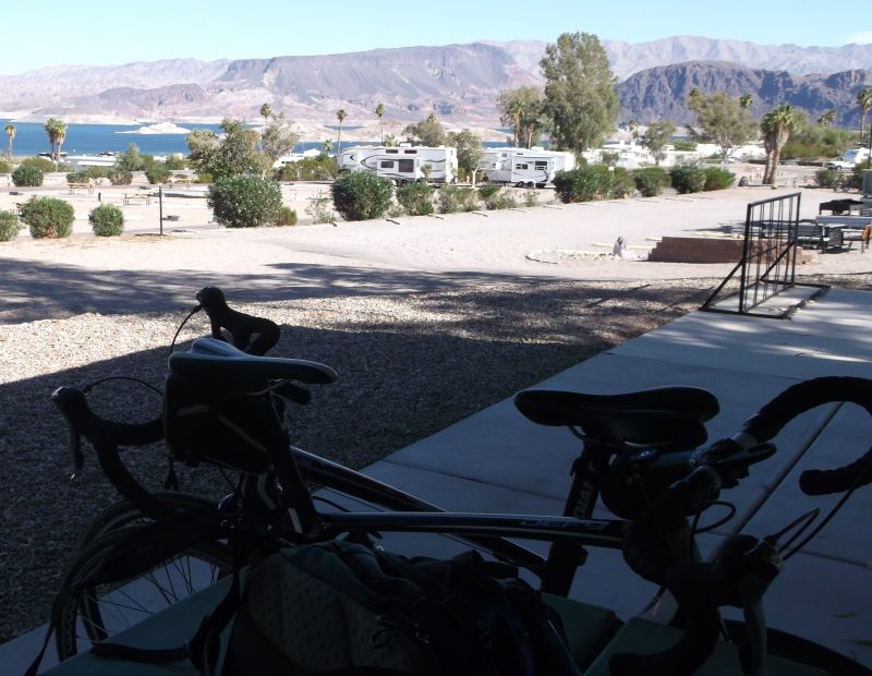 After the campground, civilization quickly fell away (well except for the excellent asphalt trail we were riding on) to be replaced by desert vistas and rocks. Also making its presence known were long hill climbs up and out of the Lake Mead valley. Making the effort more challenging were the +30C temperatures which saw water being sweated out faster than it could be consumed.