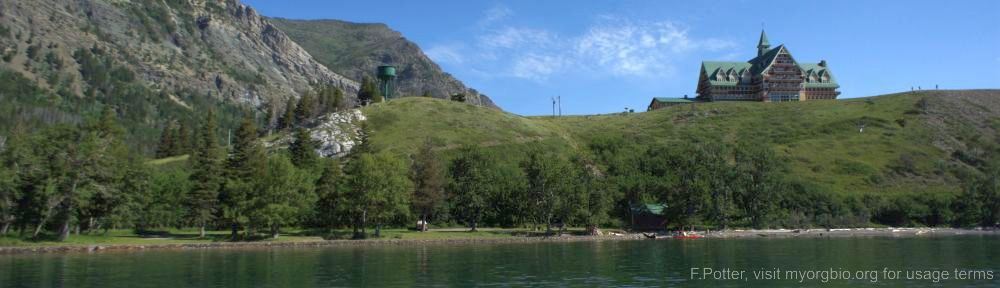 Taken from a boat trip with the USA as its destination, the Prince of Wales Hotel appears above a small and on a small hill jutting into the Waterton Lake. The Bears Hump is partially visible in the left hand side of the frame.