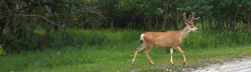 A white tail deer emerges from the forest onto the road in Waterton Park. His rack is covered with velvet.