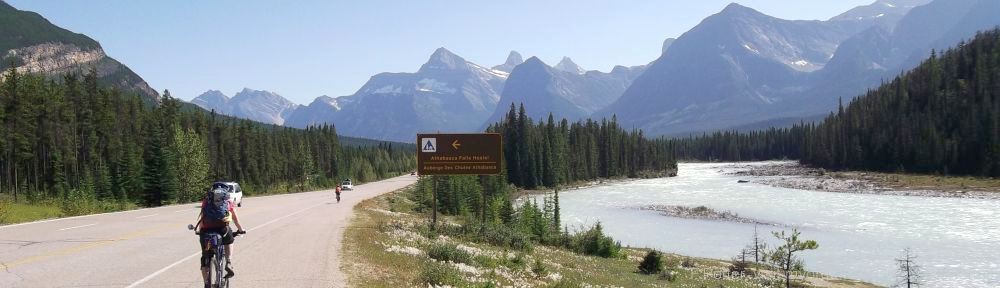 Two cyclists ascend a mountain hill towards the viewer. Behind them is a distant range cutting perpendicular across the road in the background. Spruce and pines line the highway on either side of the cyclists.