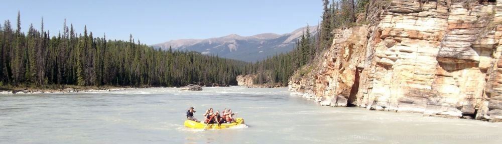 Hardy rafters are in the center frame and float on the milky Athabasca river. A yellow sedimentary face is on the right frame – it turns the river from flowing across the frame to flowing away from it towards distant rapids.