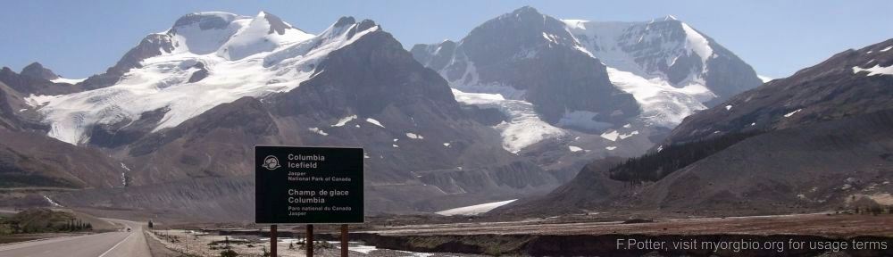Icefields sit atop of distant mountains. The Athabasca river flows in the foreground and a granit mass rises from the left of the frame.