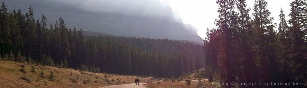 Two early morning cyclists enjoy the quiet of the Banff National Park. A mountain looms to the left and road curves away to the right to points unknown.