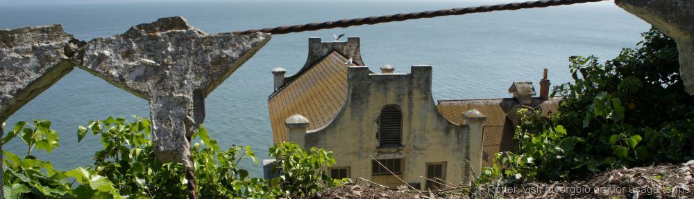 Alcatraz Island, San Francisco Bay on a sunny May day. The Golden Gate Bride is barely visible in the left background.