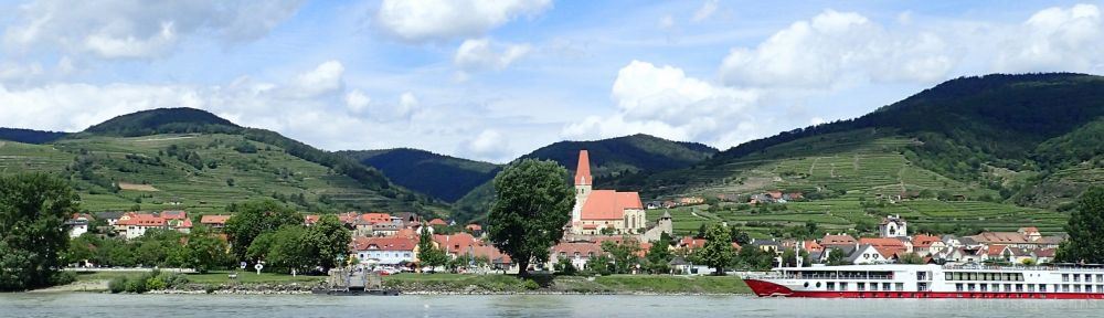 Danube River, April 2011. A fortified church is in the distance in front of green hills and vineyards.