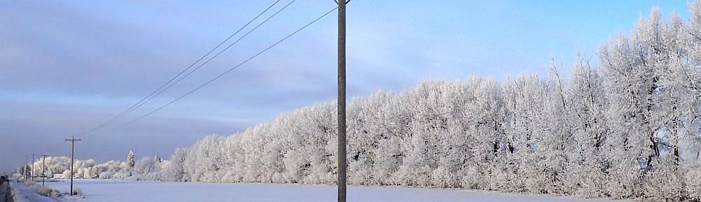 Two snowshoers ascend the rolling hills of of River lot 56. Bush to the left, a frosted powerline to the right and a large hay bail at the crest of the hill.