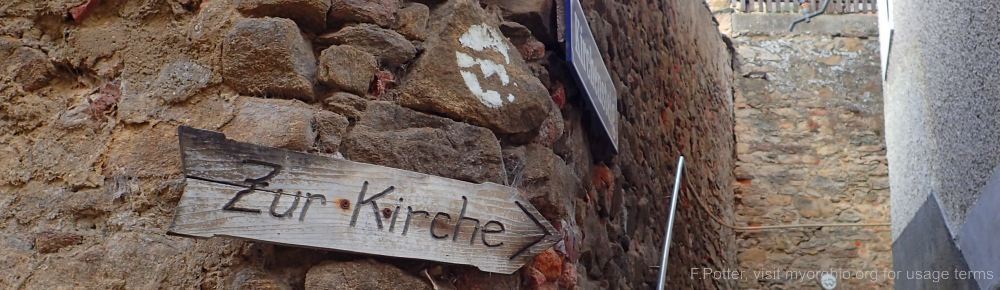 Way-faring sign post long since grown into a tree but definitely very securely attached!