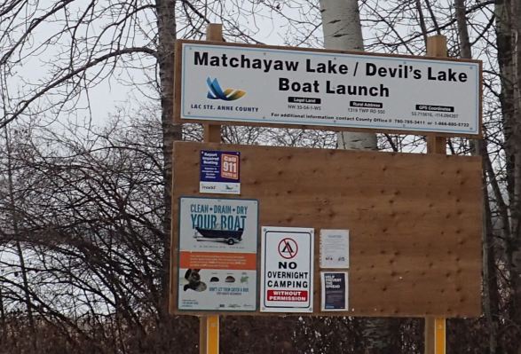 Devil’s Lake is located east of Onoway, off Highways 37. The Bilby Nature Area is on the South shore and Imrie Park Campground is on the West shore.. The Lake was originally named Matchayaw Lake (meaning Devil’s Lake) by the area’s Indigenous people. Sport fishing in Devil’s Lake includes burbot, northern pike, walleye, whitefish, and yellow perch [1, adapted].
